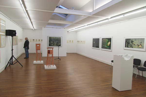 rechts an der wand und vorkopf sind großformatige holzschnitte von uta zaumseil zu sehen, dahinter die text-bildarbeiten von barbara wrede und links vor dem lautsprecher sieht man noch zwei der geschnittenen topographischen karten der schweiz von anett frontzek.